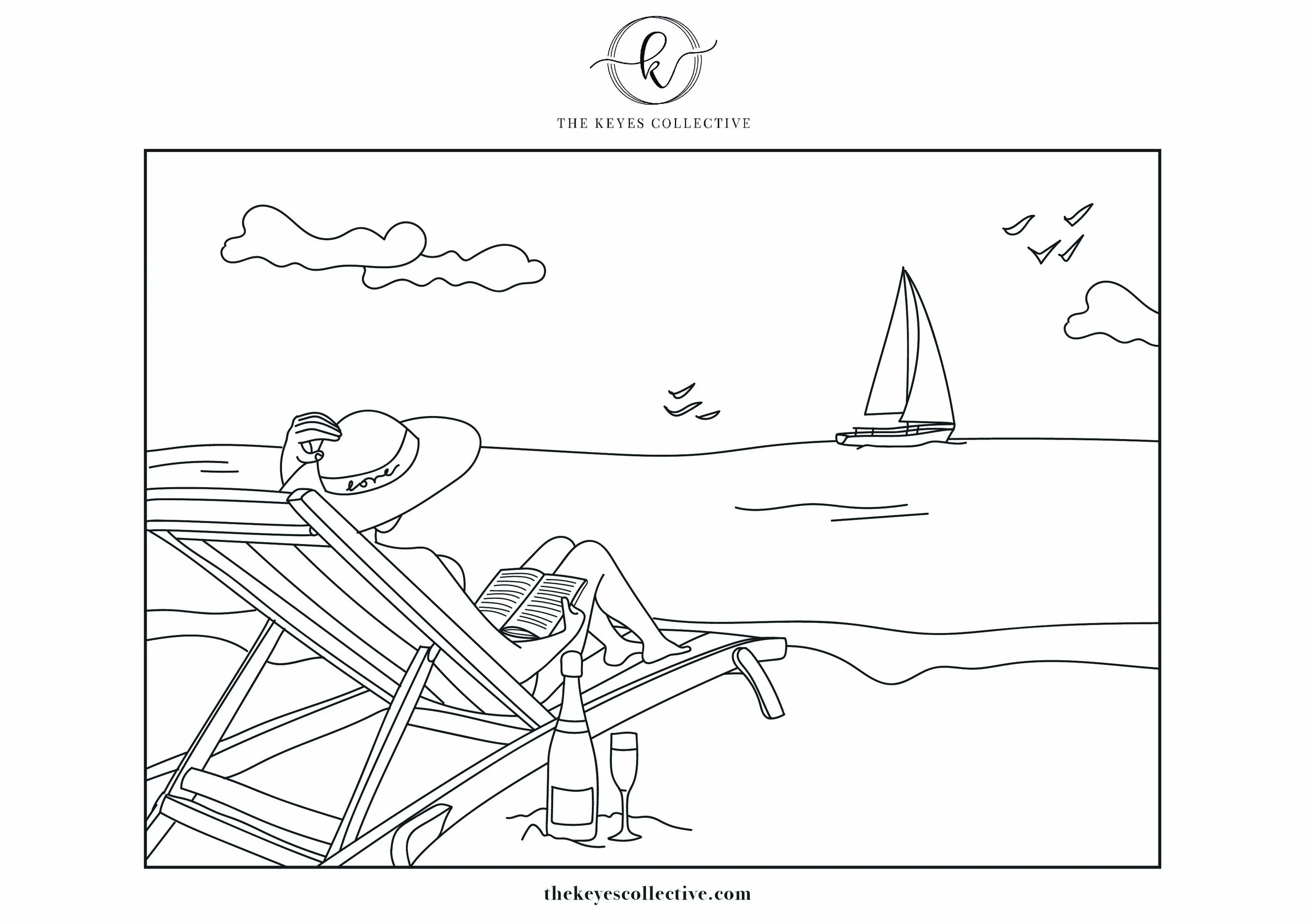 A quiet day at the beach with a glass of wine and a good book is what dreams are made of. A coloring page for our Escape series to relax and unwind to while your little ones create their own happy place.